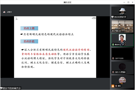 第一位授课教师费良华讲解的课程为《现代汉语2》,她在讲授部分对现代汉语语法特征的各个部分进行了准确而简要的讲解。在45分钟的讲课环节中,费良华运用理论与实际示例相结合的方法,通过媒体文段、自主造句发问,与学生形成积极的课堂互动,从语序和虚词两个方面进行深剖,充分展现了现代汉语民族性的不同表现形式。费良华将新的思政价值巧妙融入教学讲义,教学内容细致完整又不失趣味,她认真负责的教学态度和精炼的教学语言得到了评议组的一致肯定。