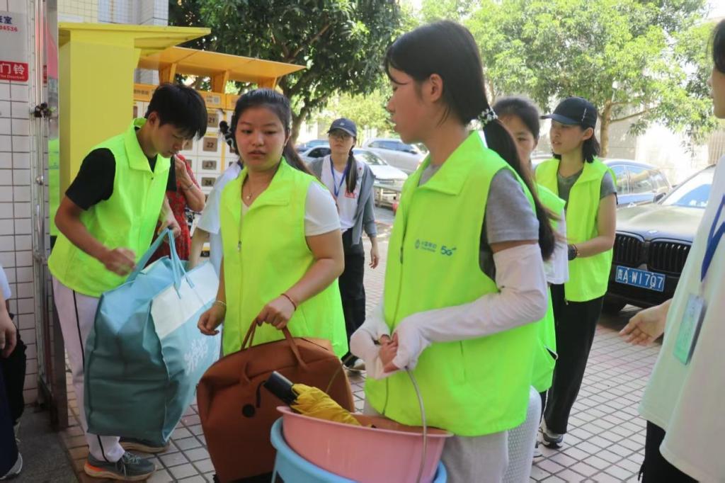 9月13日清晨,文传学院志愿者统一身着马甲,手持指引牌,守候在湖光校区西区下车点。本次迎新采用"一对一"精准迎新模式,每位志愿者对接一名新生,全程引导新生去宿舍服务点办理报到、领取物资和入住手续。他们主动协助新生搬运行李、耐心解疑答惑,并分享实用的校园信息,帮助新生快速适应环境。