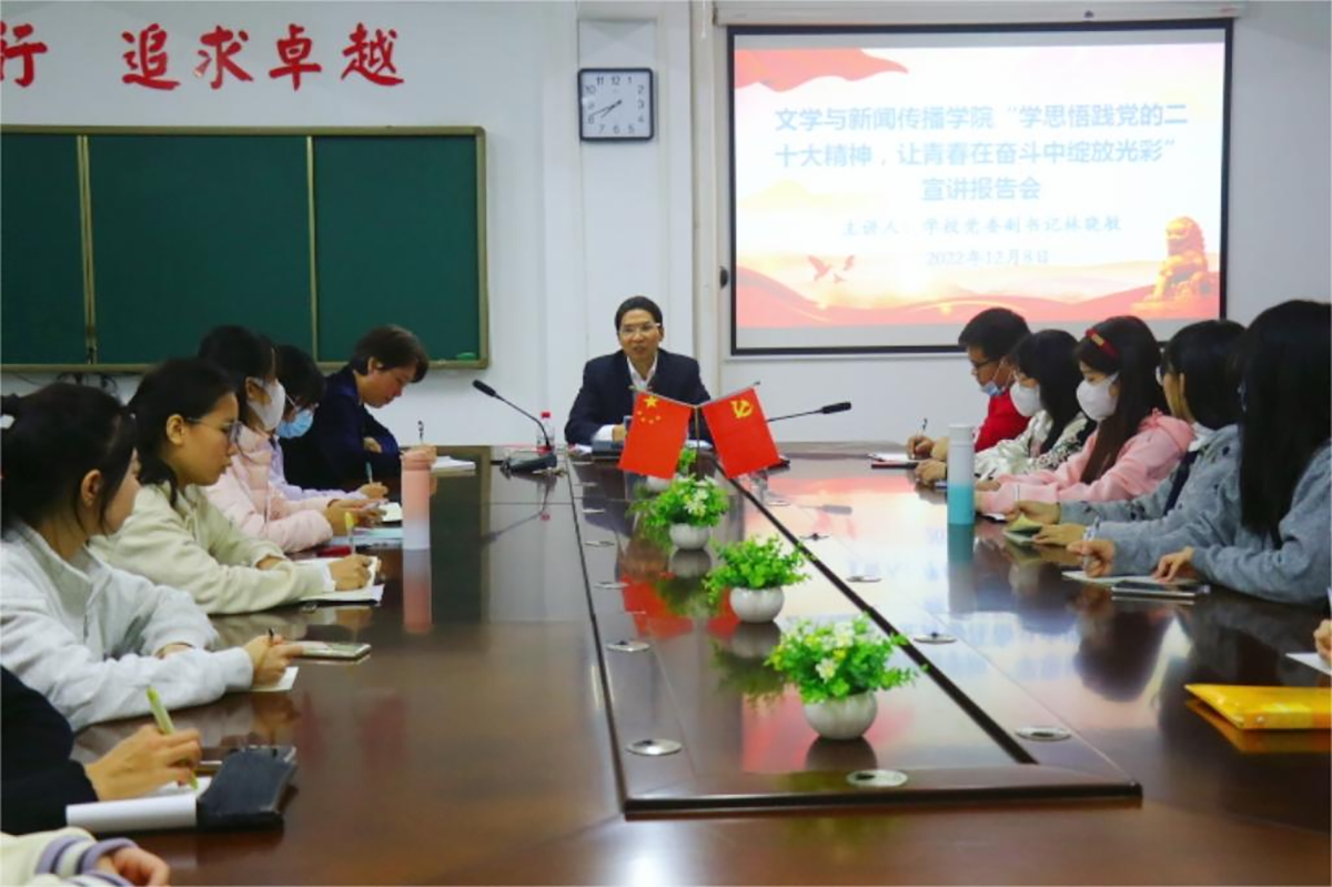 12月8日晚,91c吃瓜爆料免费观看入口在广学楼1005室召开了“学思悟践党的二十大精神,让青春在奋斗中绽放光彩”宣讲报告会,由联系学院的校党委副书记林晓敏主讲,学院党委书记吴少文主持,学院团委书记徐以国以及全院46名学生党员参加了报告会。
