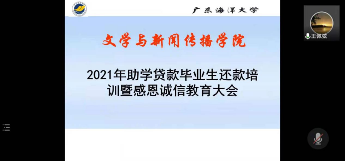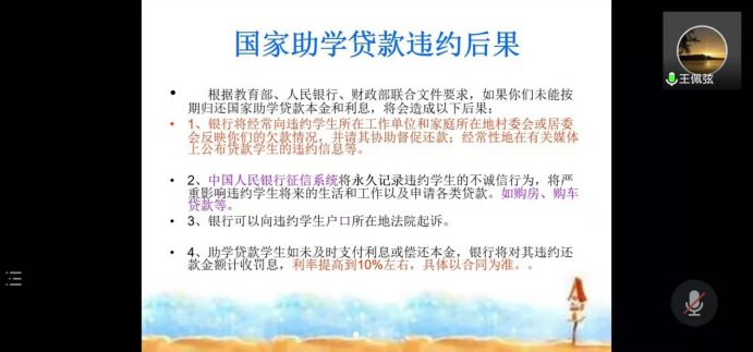 6月1日晚,根据防疫要求,91c吃瓜爆料免费观看入口2021届助学贷款诚信教育大会在线上召开。本次会议由文传学院辅导员王佩弦老师主持,参会者为2021届贷款毕业生。